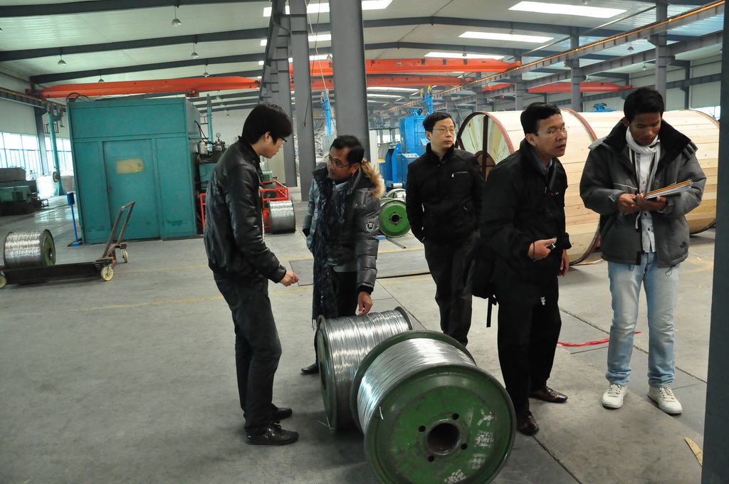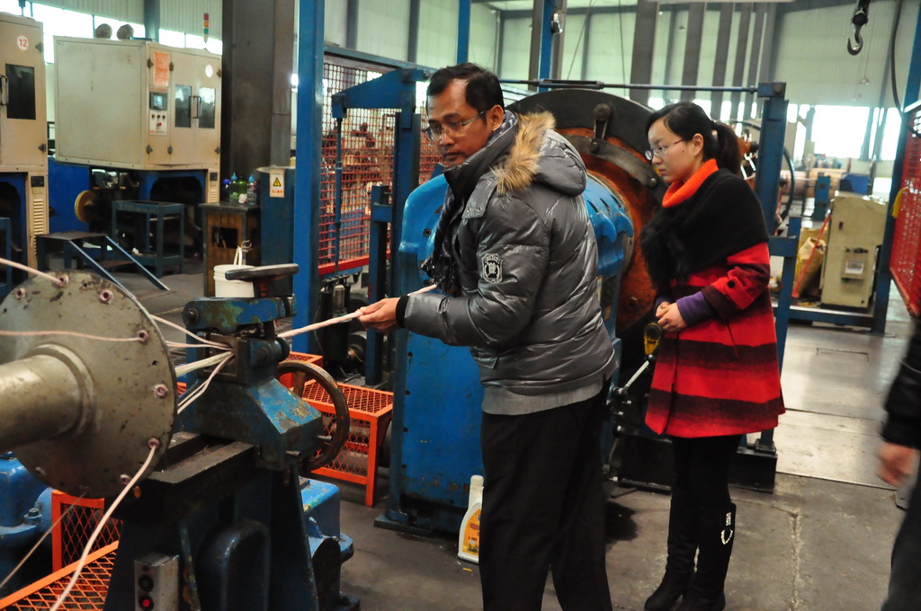 考察團(tuán)一行先后參觀了公司的電纜生產(chǎn)線、新能源生產(chǎn)基地、鋁合金導(dǎo)線生產(chǎn)線。每到一處,考察團(tuán)一行人員都認(rèn)真聽(tīng)取了有關(guān)同志的產(chǎn)品講解,觀看了產(chǎn)品的工藝流程,考察團(tuán)對(duì)我集團(tuán)科學(xué)化的企業(yè)管理,現(xiàn)代化的檢測(cè)設(shè)備、先進(jìn)的制造工藝給予了極高的評(píng)價(jià)??疾靾F(tuán)一行還深入到導(dǎo)線檢測(cè)中心,抽取了部分導(dǎo)線樣品,做了關(guān)于強(qiáng)度、延伸率、電阻率等性能的檢測(cè)實(shí)驗(yàn),實(shí)驗(yàn)結(jié)果得到了柬埔寨專(zhuān)家的一致肯定。