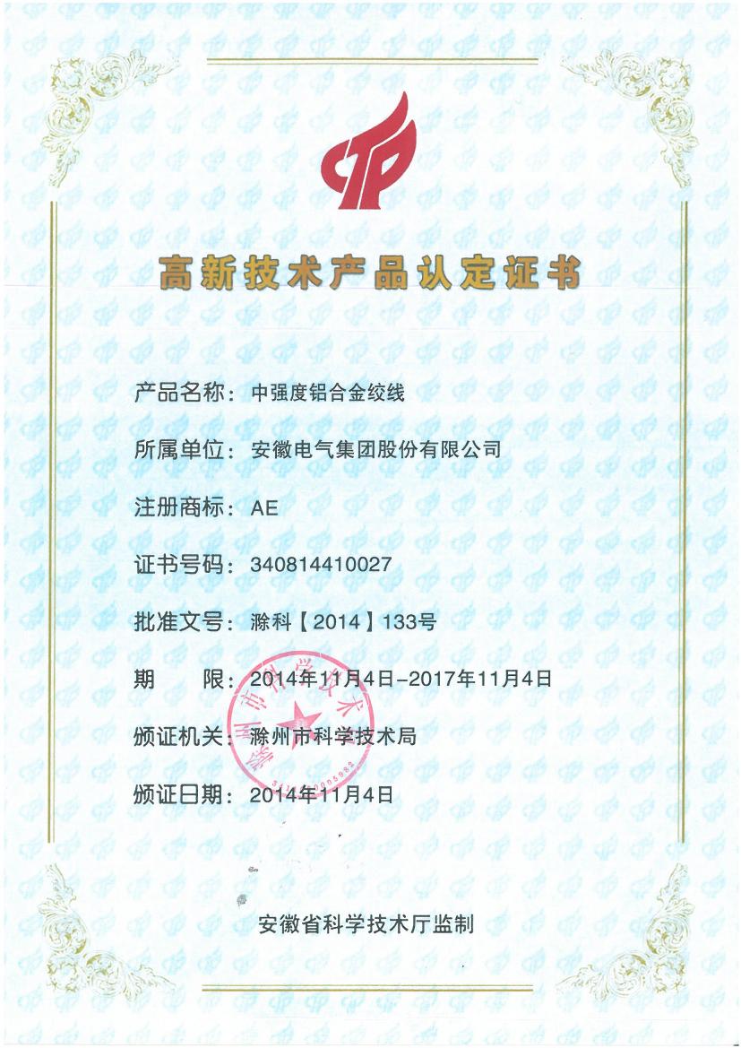 2014年11月4日,安徽電氣集團(tuán)自主研發(fā)的中強(qiáng)度鋁合金絞線,被安徽省滁州市科學(xué)技術(shù)局認(rèn)定為高新技術(shù)產(chǎn)品,榮獲《高新技術(shù)產(chǎn)品認(rèn)定證書》。